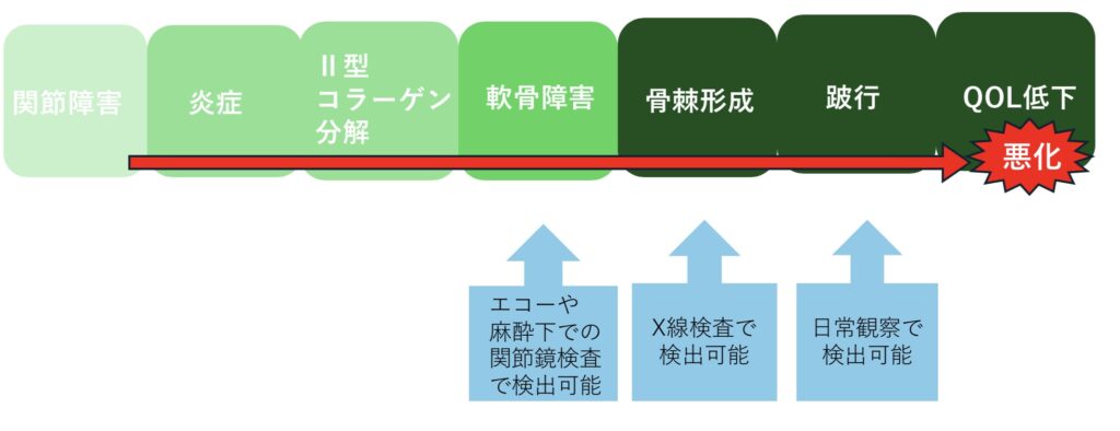 上図は、関節障害の発生から跛行に至るまでのOAの一連の変化と、各検査のOA検出可能時期を時系列で示しています。