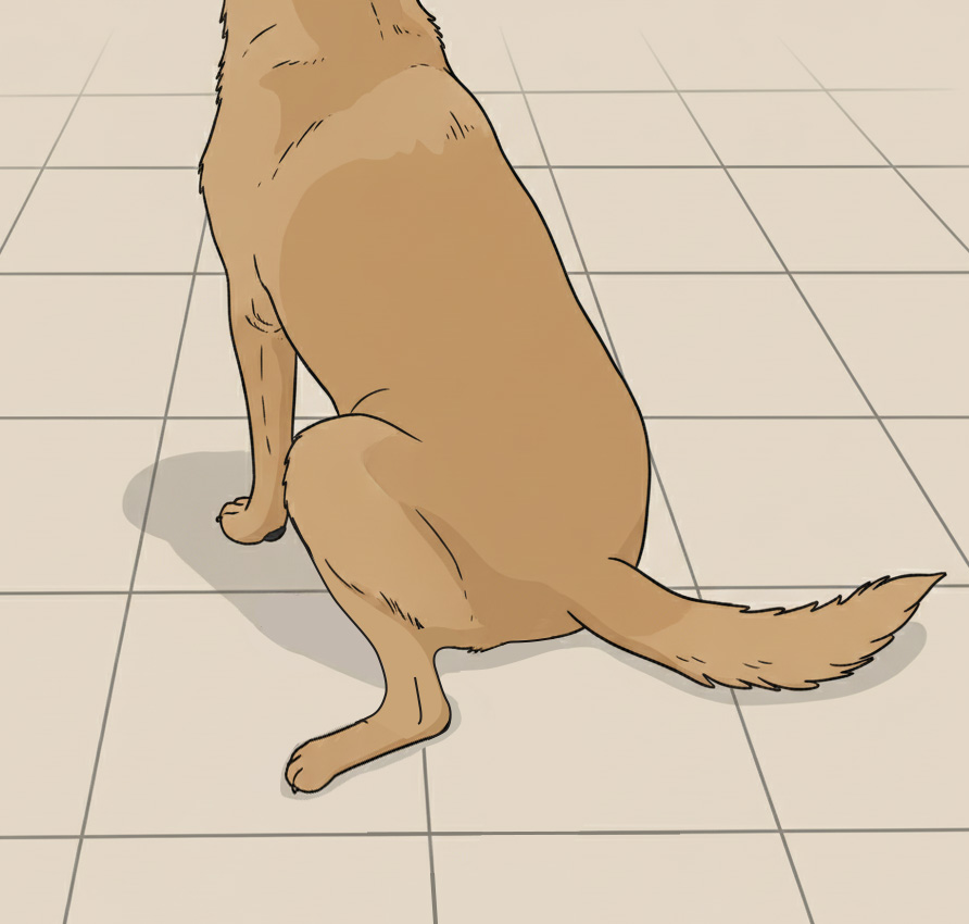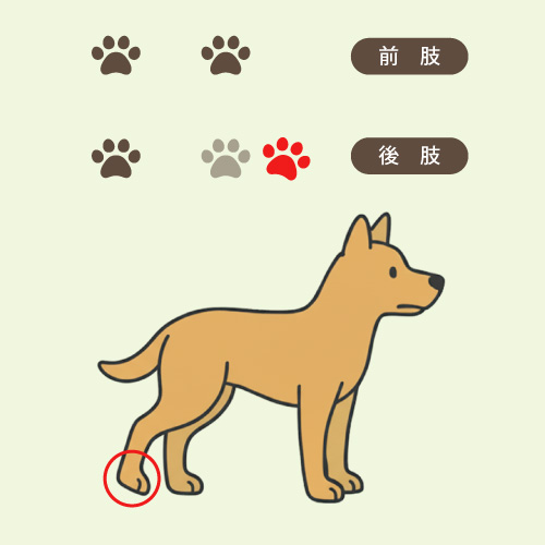 足に痛みを抱えている場合、痛い足に体重がかからないような立ち方をします。四肢のパットの配列異常や、痛い足の足先が他の足の足先(通常進行方向を向いている)と違う方向を向いていないかなどを観察してみてください。