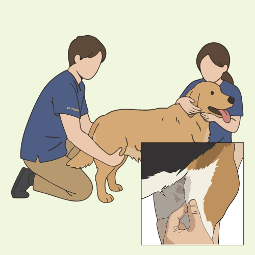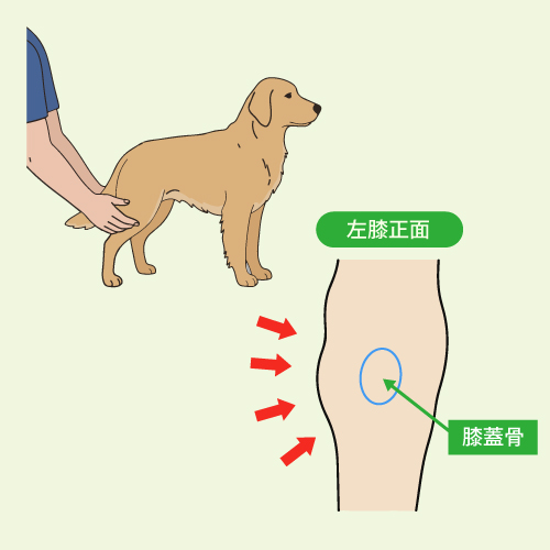 愛犬の後ろに立ち、膝の内側を左右同時に触ってみてください。慢性的なトラブルを抱えている膝の内側は、反対側の膝の内側よりも硬く腫れていることがあります。